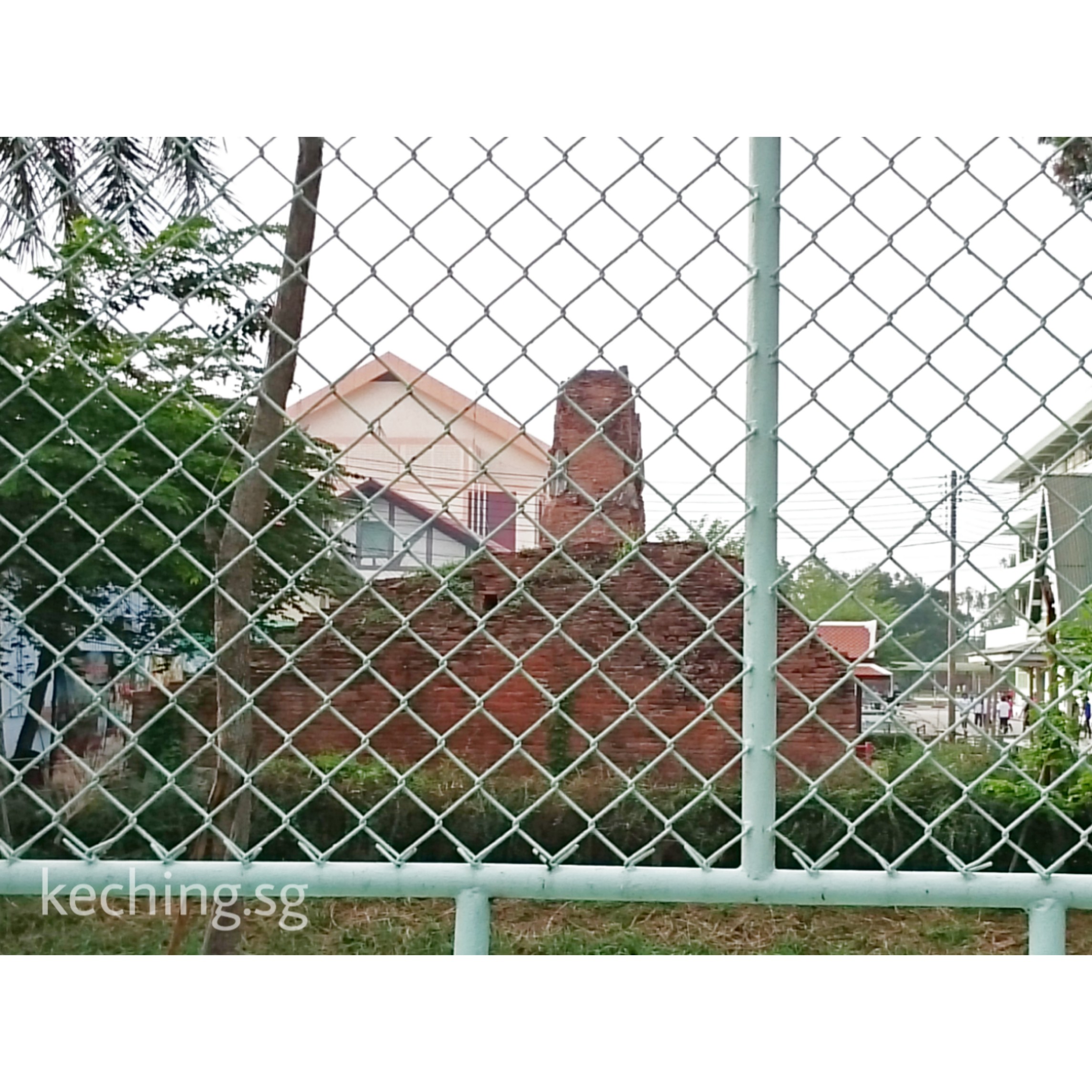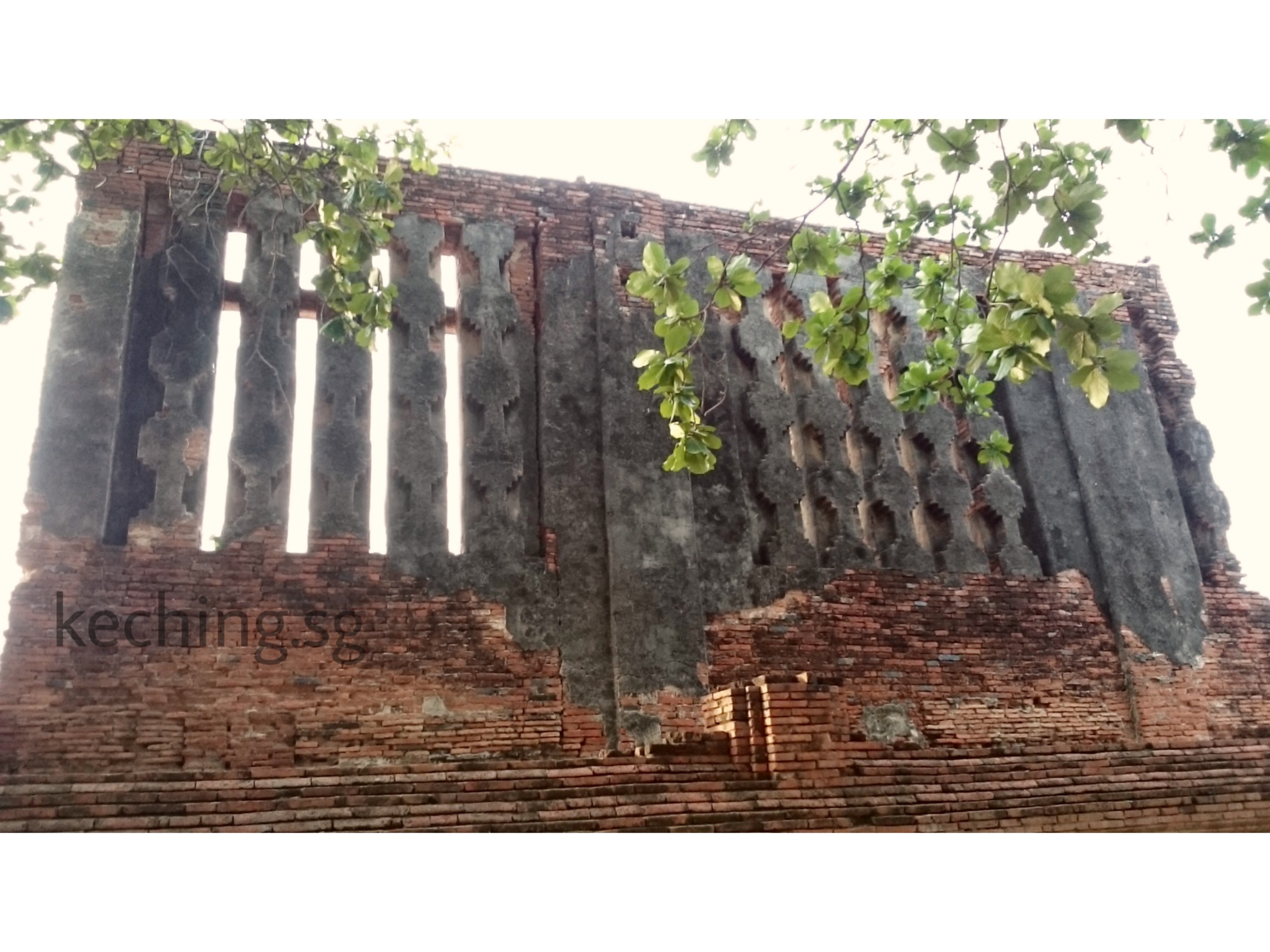 The columns between the brick base of the wall and the brick top has mostly been reinforced by concrete. Some red bricks peek through the concrete from within. The column designs were replicated, albeit in concrete.
