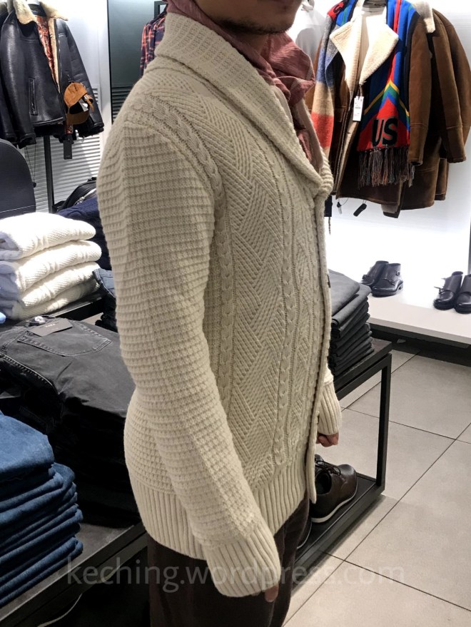 A beautiful double breasted cardigan, but in black and made in China. The one below is made in Romania. Blah blah…