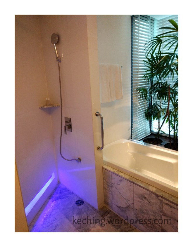 The purple light adds a touch of modernity as we walk from the corridor into the shower area.