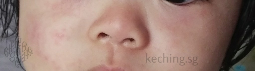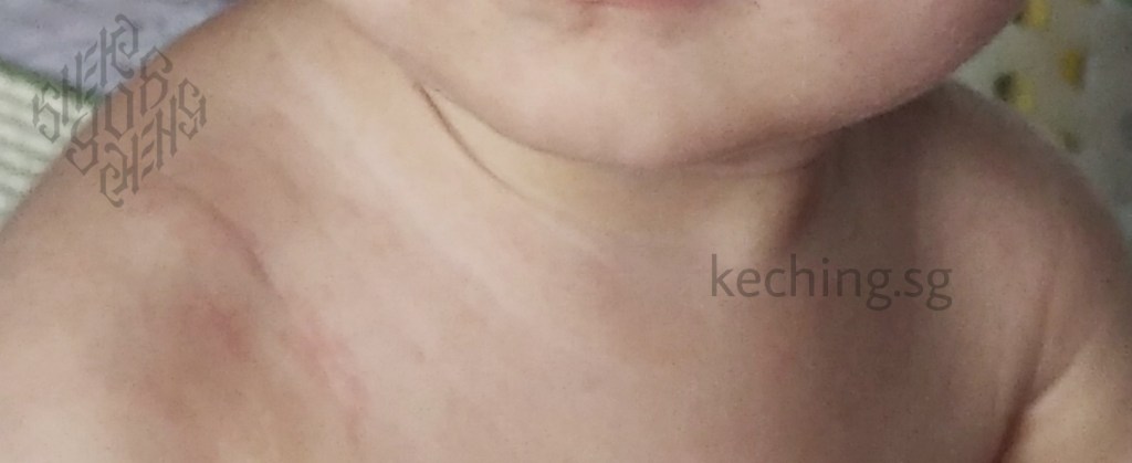 Sunday: even though darling’s fever had clearly subsided though still present, and we took her off her paracetamol, rashes started appearing. By Monday, her skin looked like this: