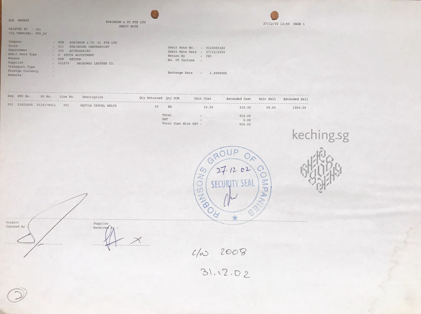 Just one debit note dating back to 27th December 2002, out of many years and trade with other Robinsons related companies like John Little. It is just one of many paper documentation that lies in our storeroom.