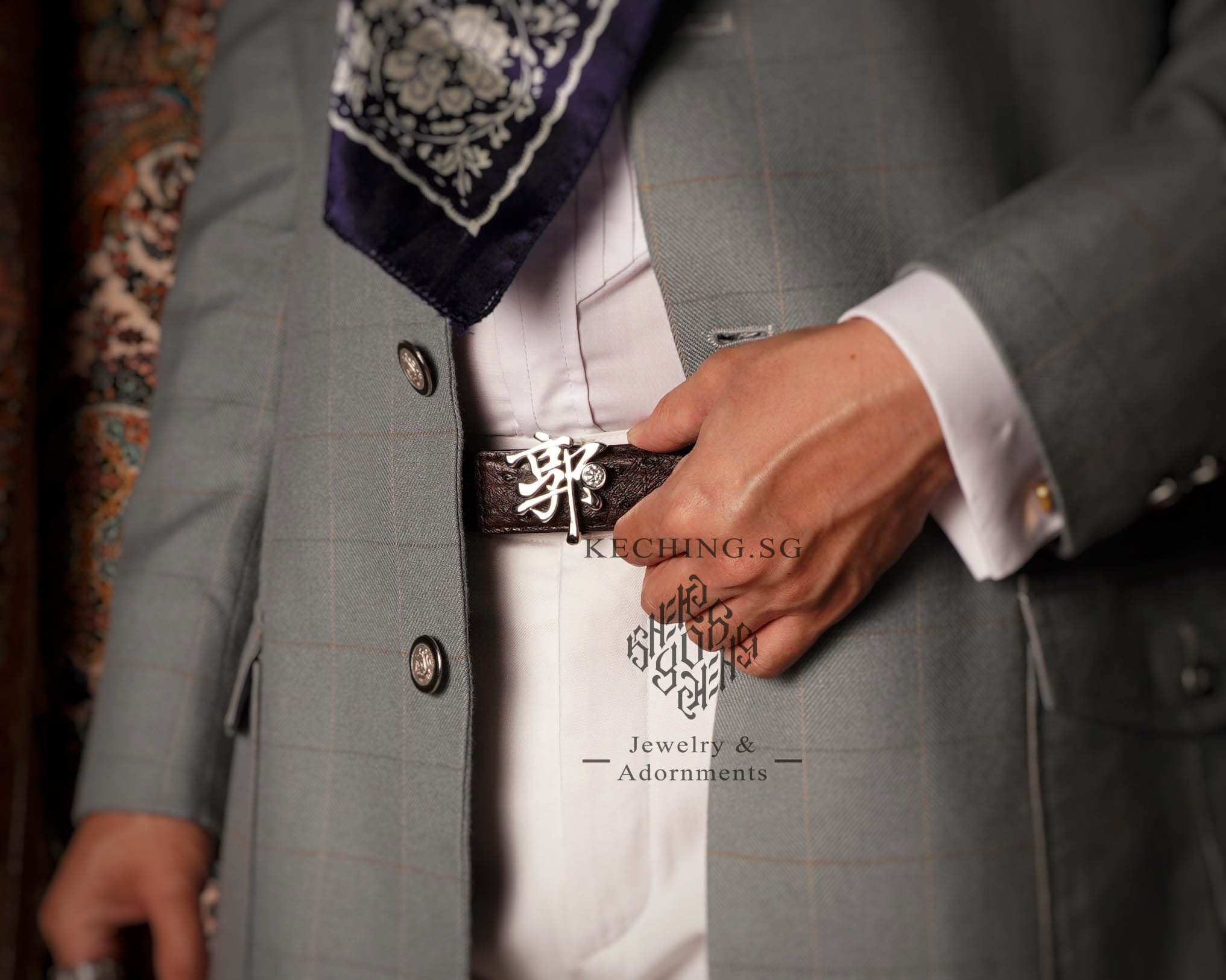 Custom 925 sterling silver buckle is coupled with a dark brown ostrich leather belt by Aquila (aquilafashions.wordpress.com).