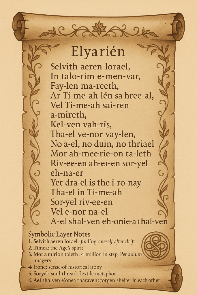 And so after the Great Purge, Arananyel lost his beloved Siraël. Just when they had co-created a language, as a long time coming revelation, for the subjects of the Land, called Elyariën. A whisper and wind based language that matched the breath, cadence and pace of the Architect, born of Fragrance and Flatulence sewn and woven into their very fabrics of space and time.